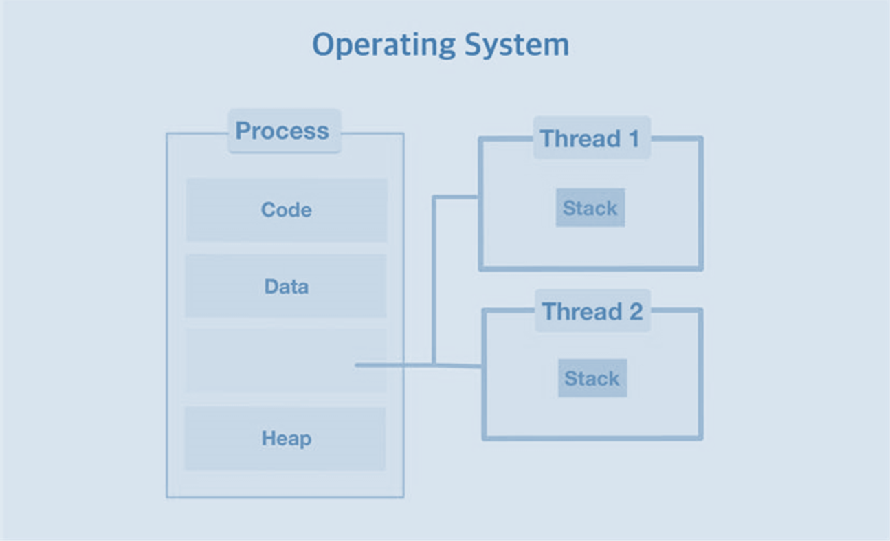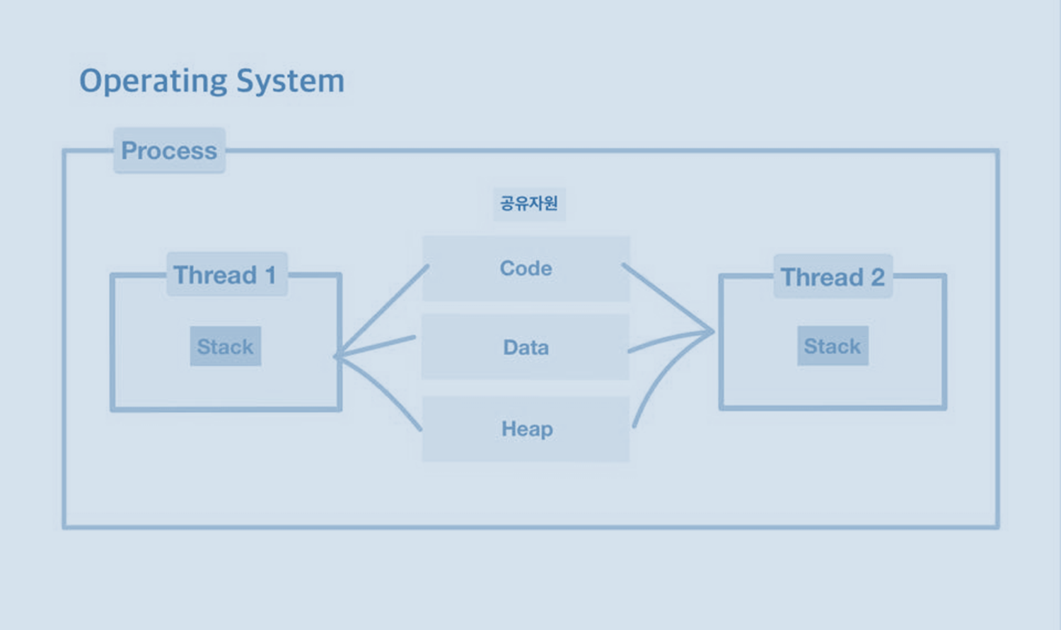 - Thread 는 Process 내에서 Code, Data, Heap 영역을 공유한다