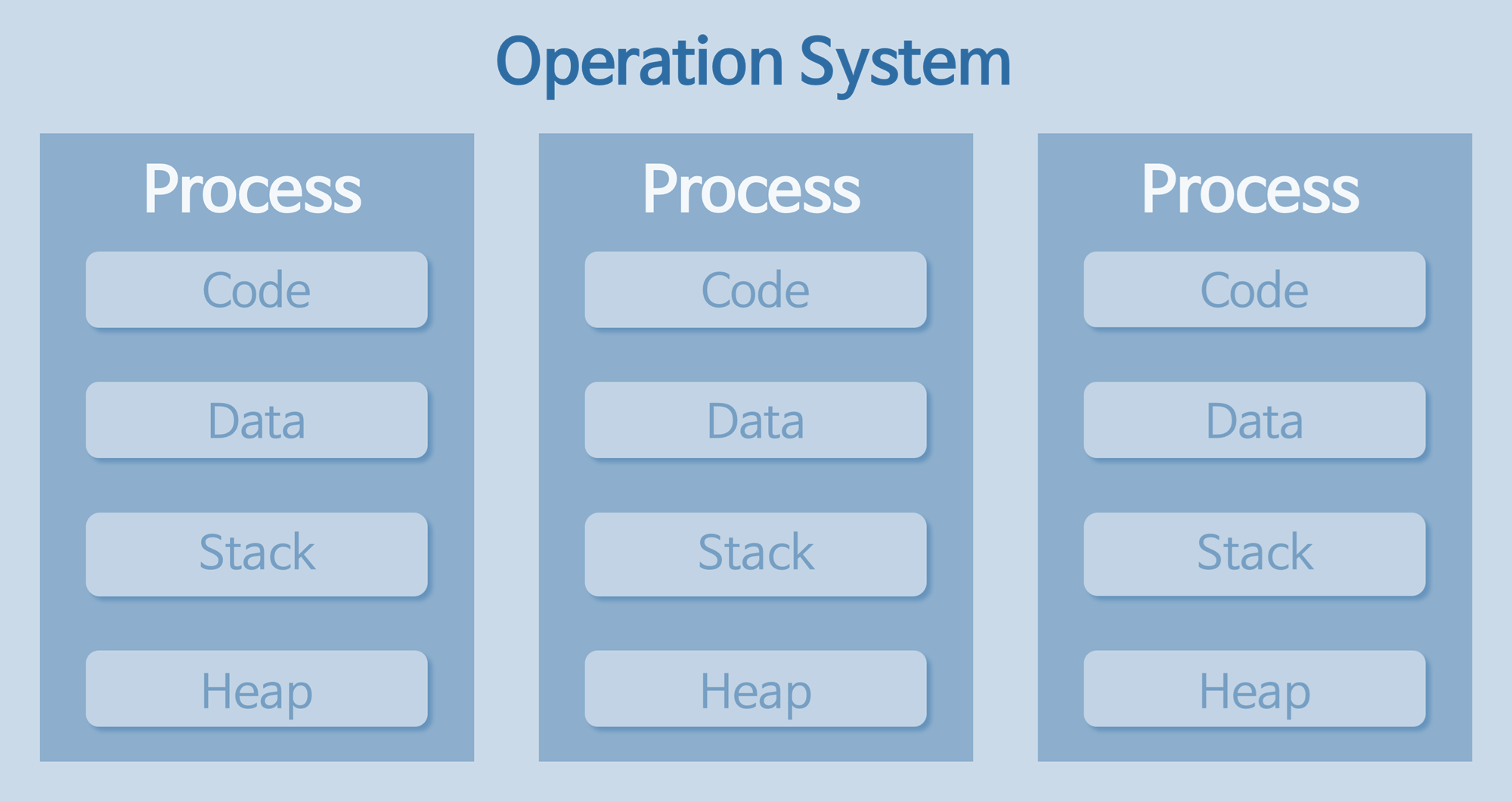 - 각 Process 는 별도의 주소 영역에서 실행되며, 독자적인 메모리 영역을 갖기 때문에 Process 간 메모리 영역의 공유는 불가