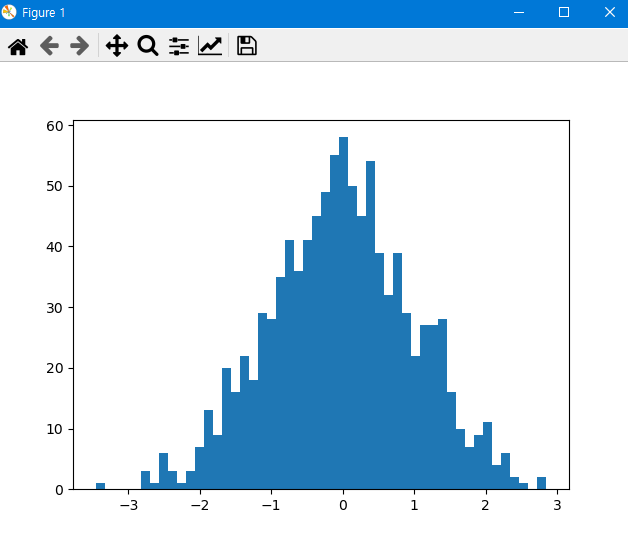 ax.hist(data, bins=50) # bins=50 - 50개의 막대로 data 를 표현한다.